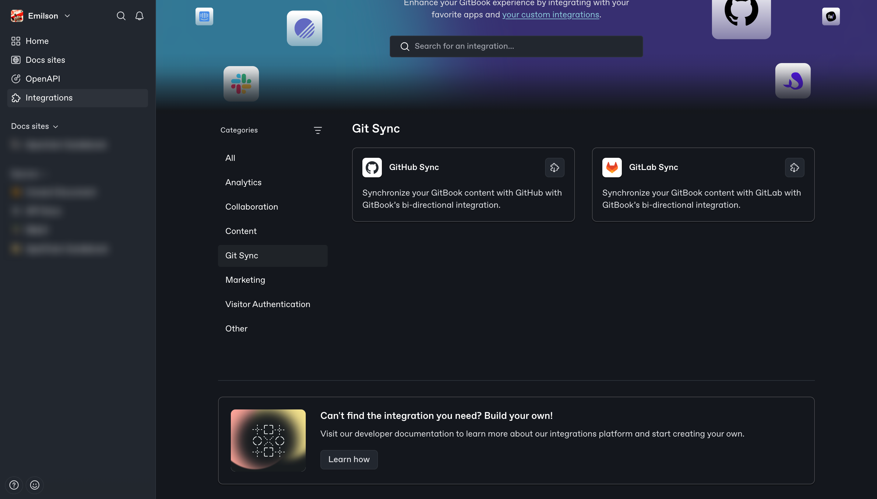 GitBook handles everything in one place, such as text, images, and code snippets. However, the most notable feature is Git Sync. It connects directly with GitHub and GitLab, so devs can push updates straight from their usual Git workflow, while writers can work comfortably in GitBook's editor.