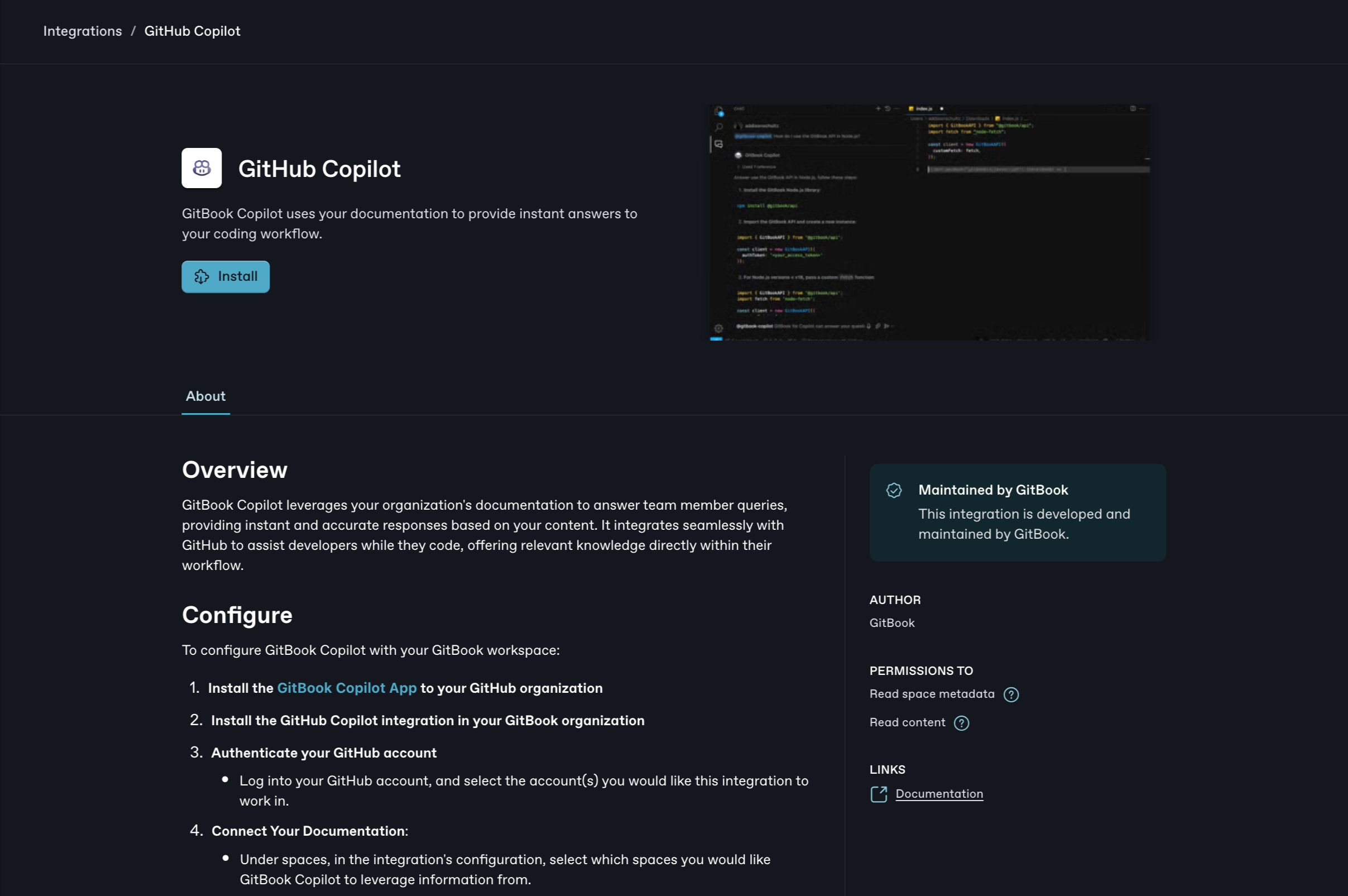 GitBook integrates with GitHub Copilot to deliver real-time answers from your documentation directly within your coding environment. It helps developers quickly access relevant information while working, whether setting up projects, debugging, or referencing internal guides.
