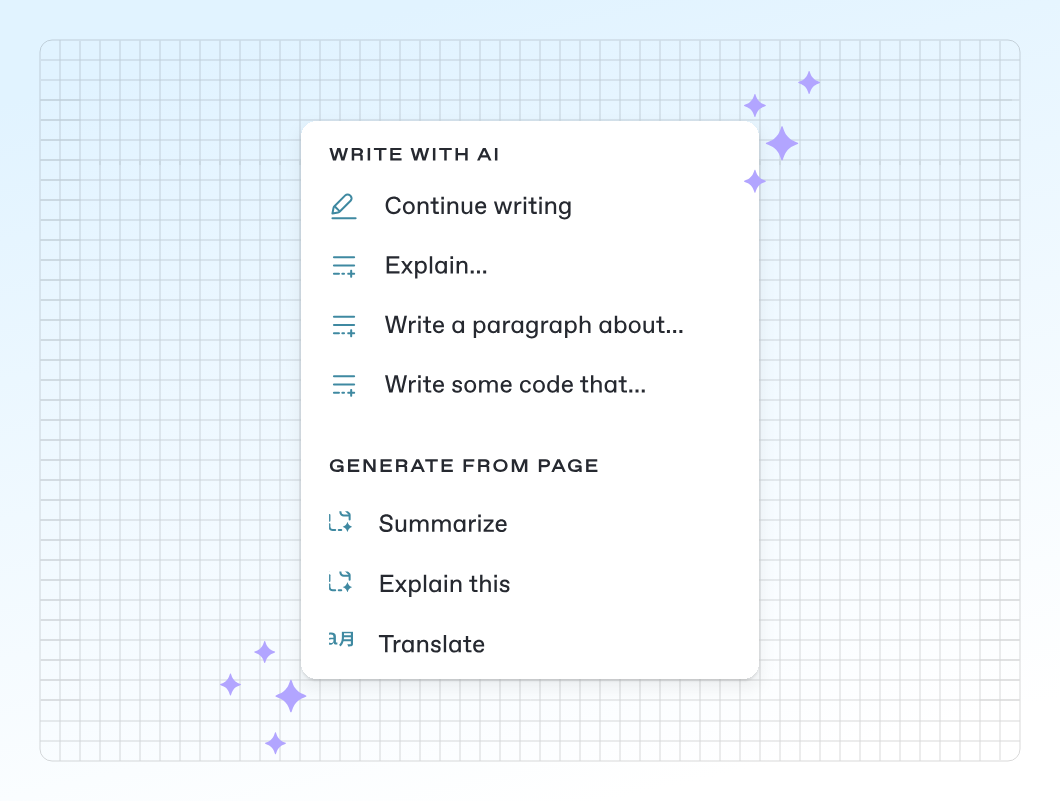 GitBook AI allows you to generate content directly within your docs, from summaries and templates to code samples, all formatted in Markdown.