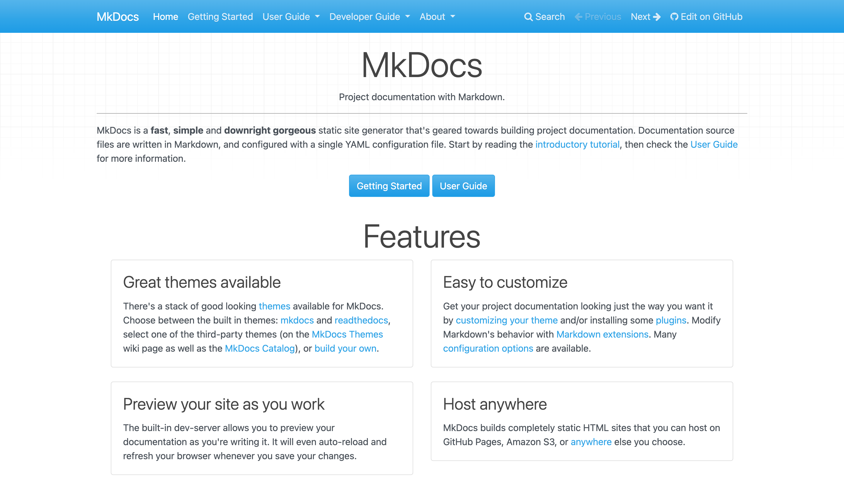 MkDocs highlights key features with configuration options and live preview tools for documentation.