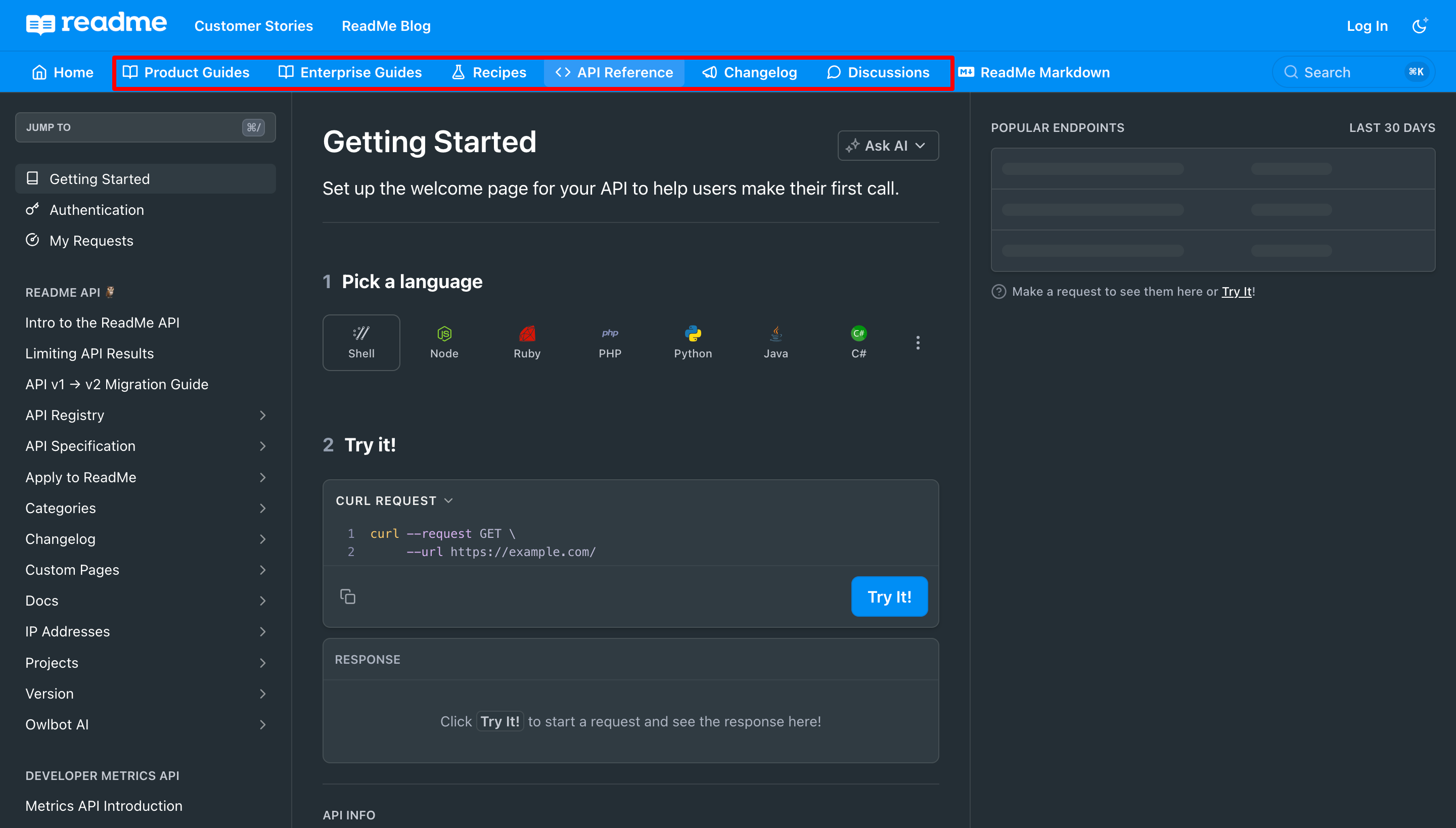 ReadMe is a good choice for non-technical teams that want full control over layouts and landing pages, without writing any code. It supports live tutorials, quick API spec imports, and built-in community forums that help boost engagement. Whether you're working on a B2B product or managing a platform-as-a-service, it provides the tools to create a connected and interactive documentation experience.