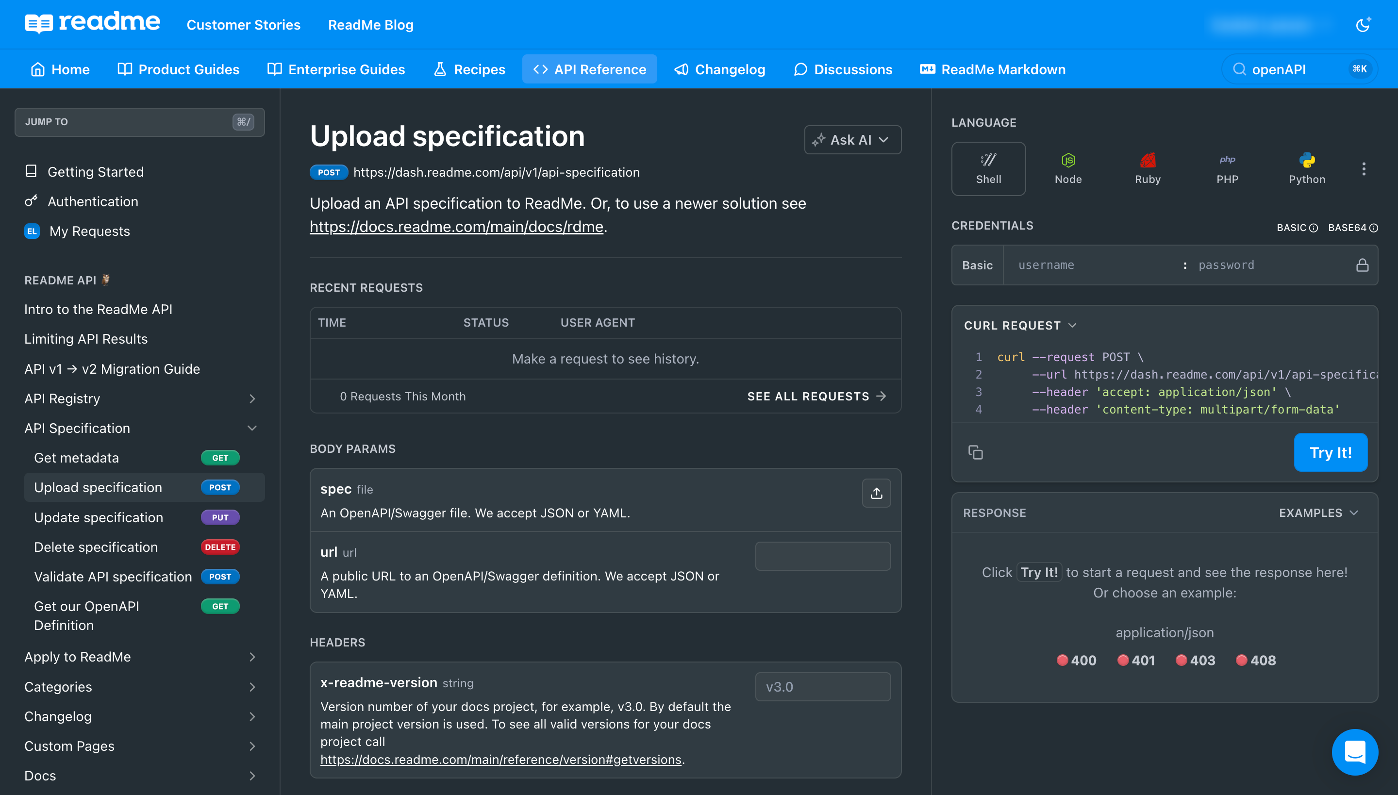 ReadMe makes it easy to spin up API docs, upload your OpenAPI files or Postman collections, and it handles the rest automatically.