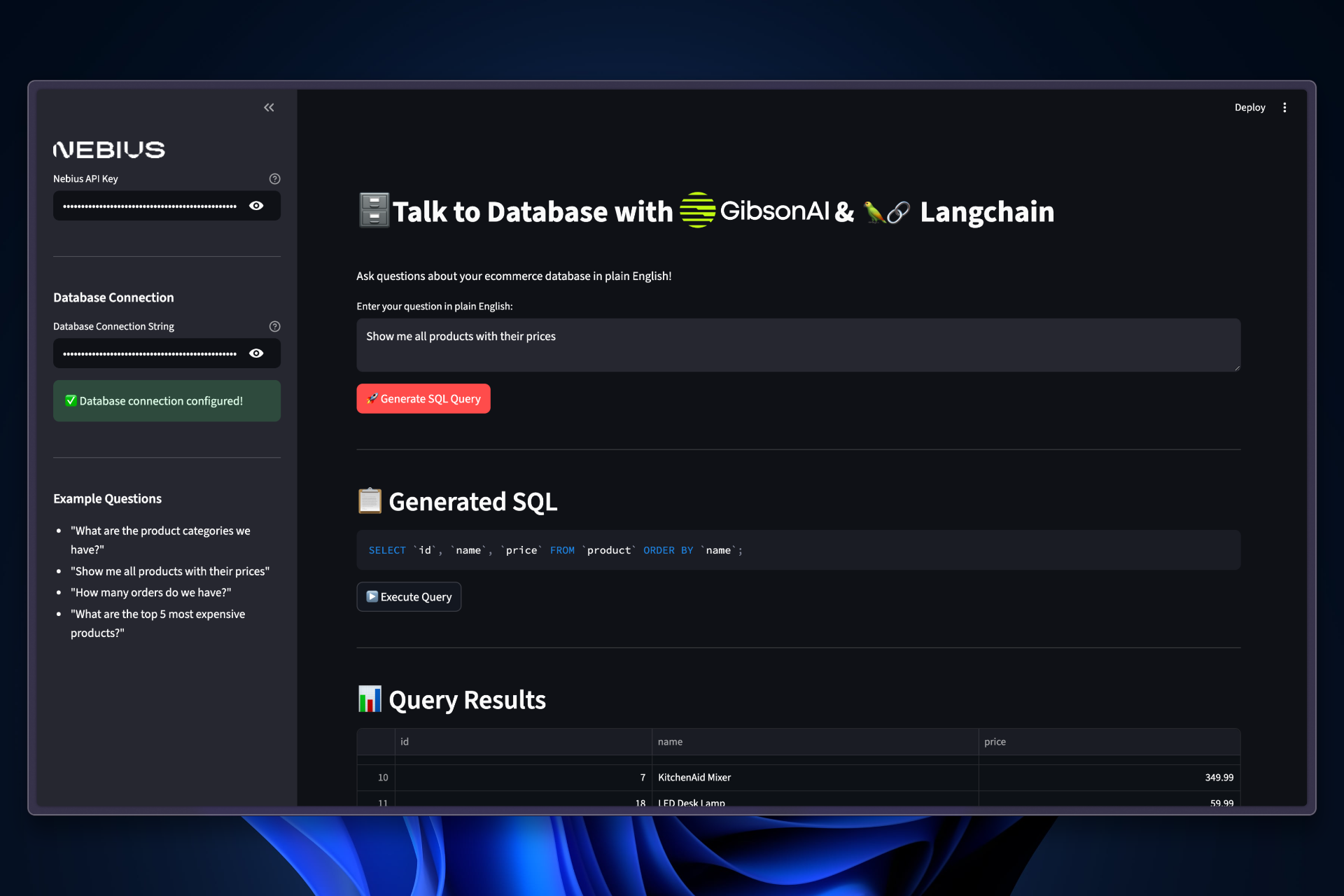 Talk to Your DB is a powerful AI-powered database query tool that translates natural language questions into SQL queries using Nebius AI. This application makes database operations accessible to non-technical users by allowing them to interact with MySQL databases using plain English.
