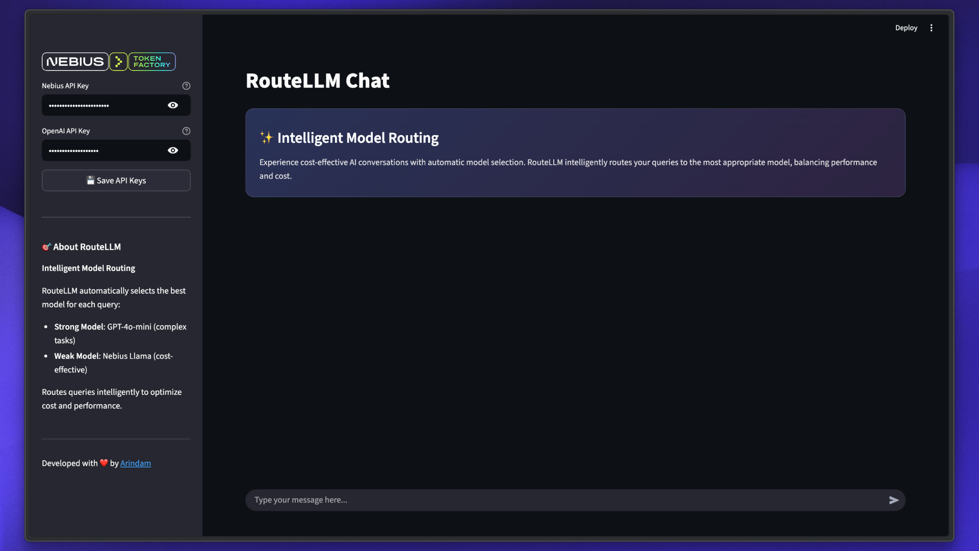 RouteLLM Chat is an intelligent AI chat application that automatically routes queries between cost-effective and high-performance models using RouteLLM. Experience cost-optimized conversations with automatic model selection that balances performance and cost.