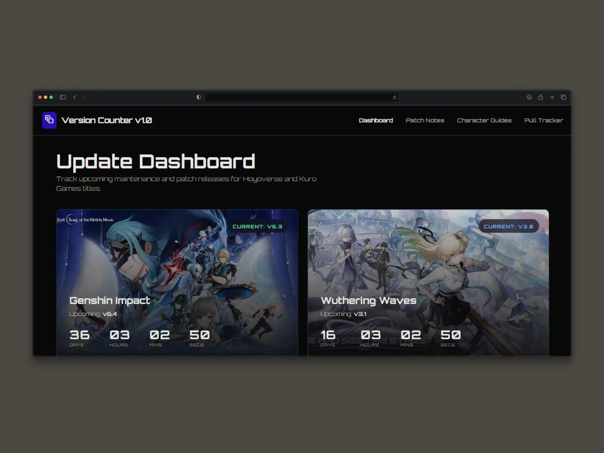 Version Counter is a web application that helps gacha game players track upcoming version updates and maintenance schedules. Stay informed about when new content drops for your favorite games with beautiful, real-time countdown timers.Supported Games
