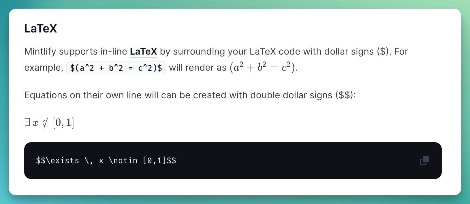 We now support LaTeX in our docs. To use them in your interface, use $ before and after your code to convert it into LateX styling in-line. To create LaTeX in its own line, simply use $$ before and after your code. Read more from the docs here.