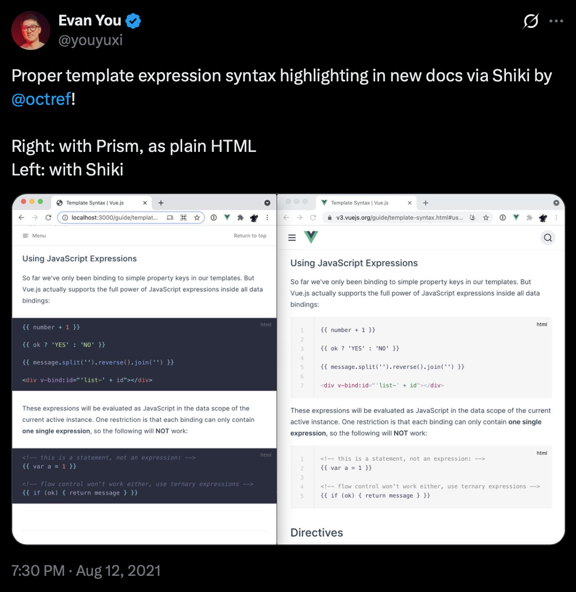 There was clear demand for IDE-like syntax highlighting in the browser with no JavaScript overhead. Since 2020, Shiki has grown from 5,000 to 15,000,000 weekly downloads.