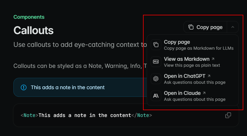 To make AI interactions even smoother for end users, Mintlify also allows any page to be copied as Markdown for LLMs or viewed in its raw Markdown form. It also enables opening a documentation page in ChatGPT or Claude with a single click, without copying and pasting it manually.
