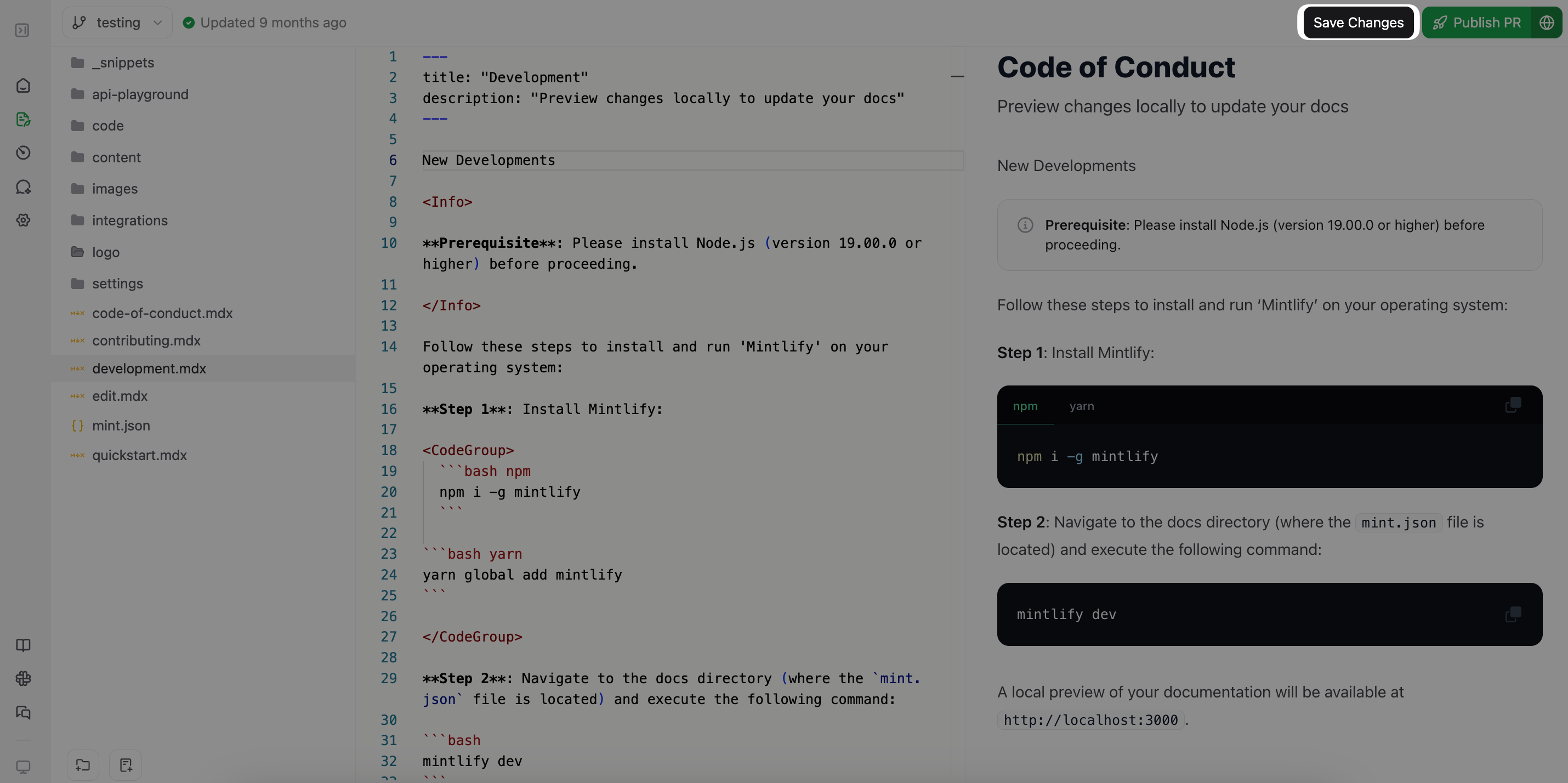 At some point, you may want to take a break from editing your docs. You can simply click on `Save Changes` to make sure the edits you made so far stay on your branch.