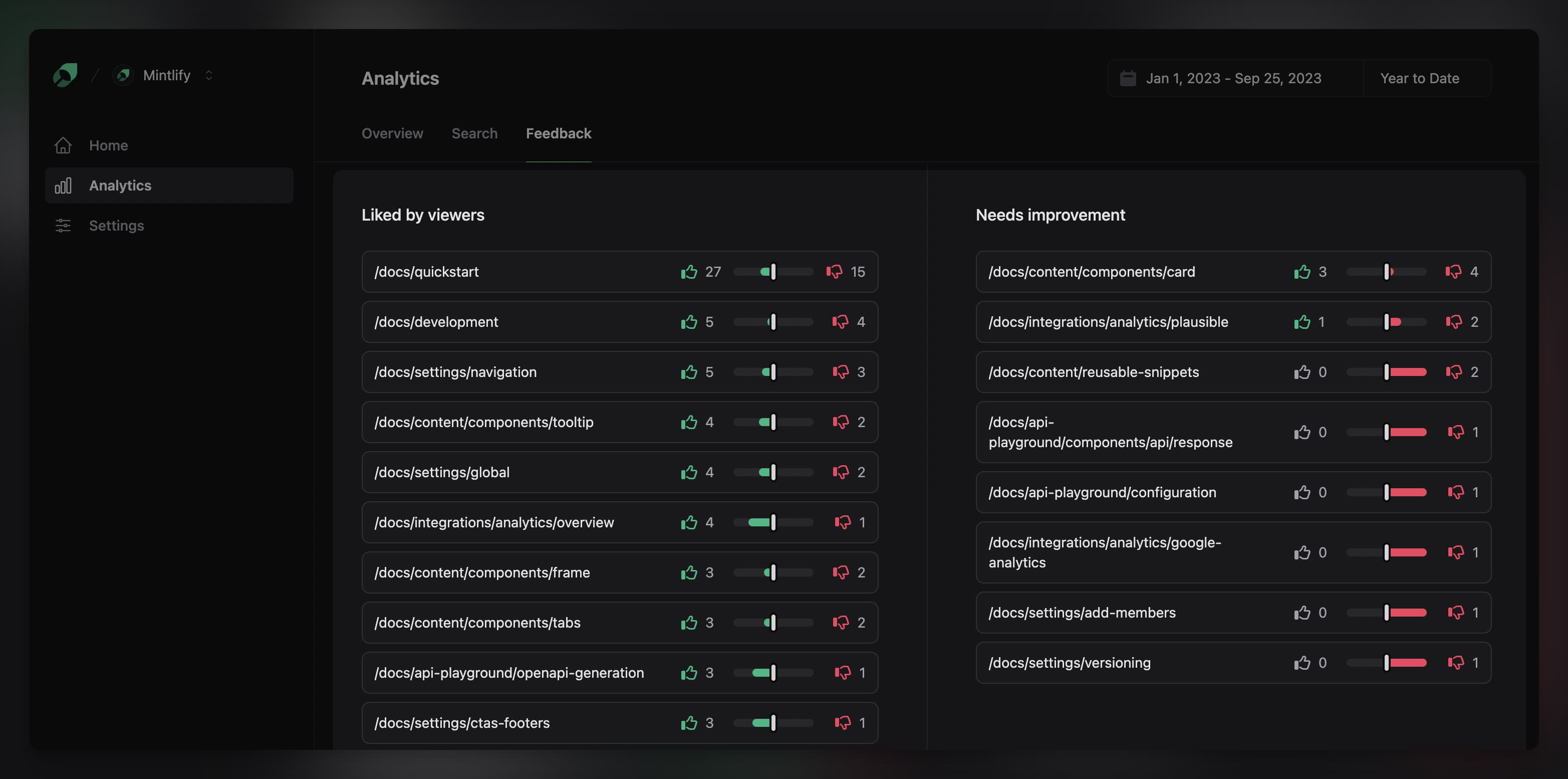 With Docs Feedback, users upvote or downvote the helpfulness of a page and you can access that feedback right in your analytics.