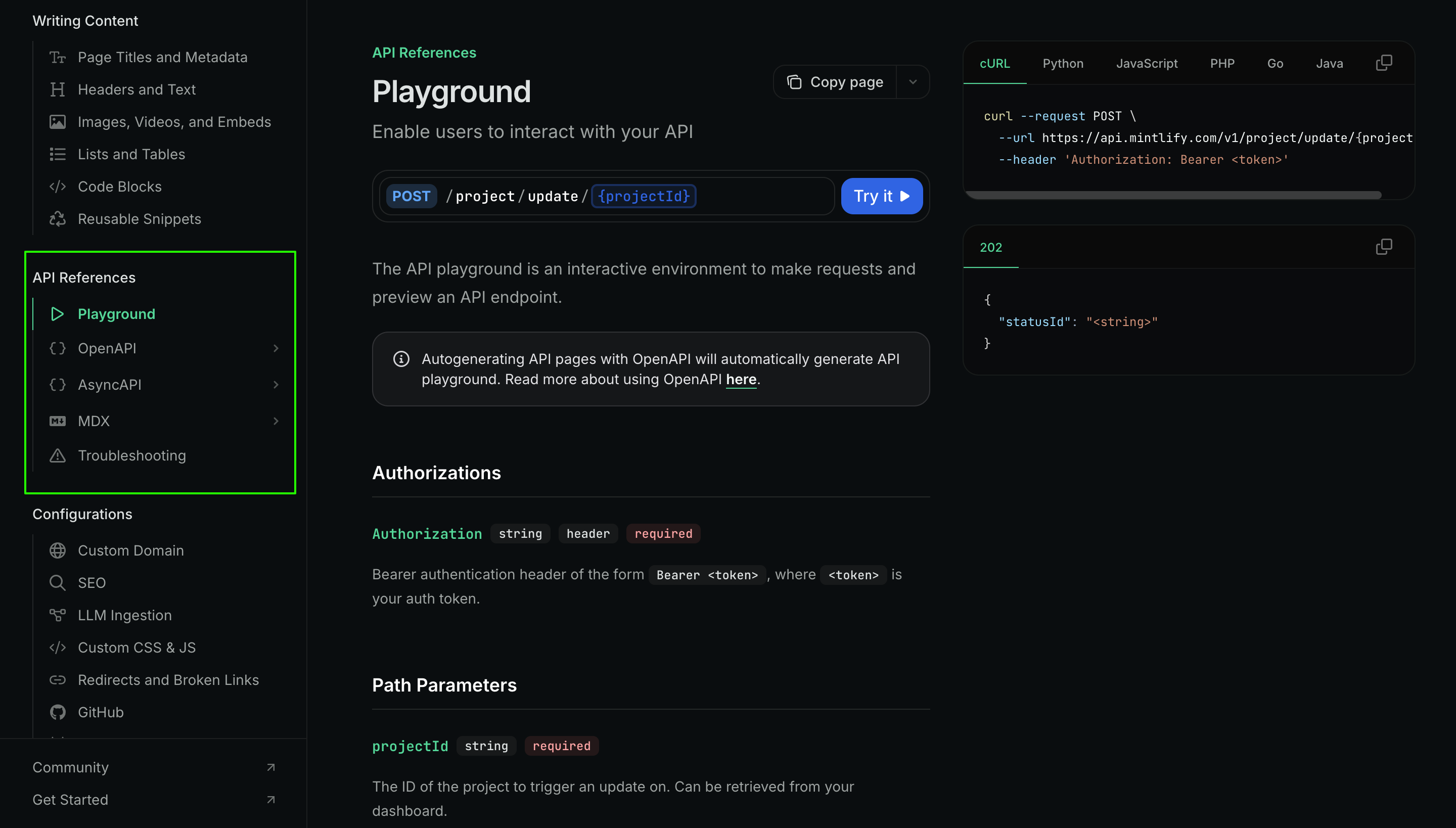 Some popular tools are starting to bridge this gap between automation and control. For example, Mintlify supports OpenAPI-based generation while also allowing teams to layer in custom guides, tutorials, and interactive elements, all without requiring the development of a custom document from scratch.