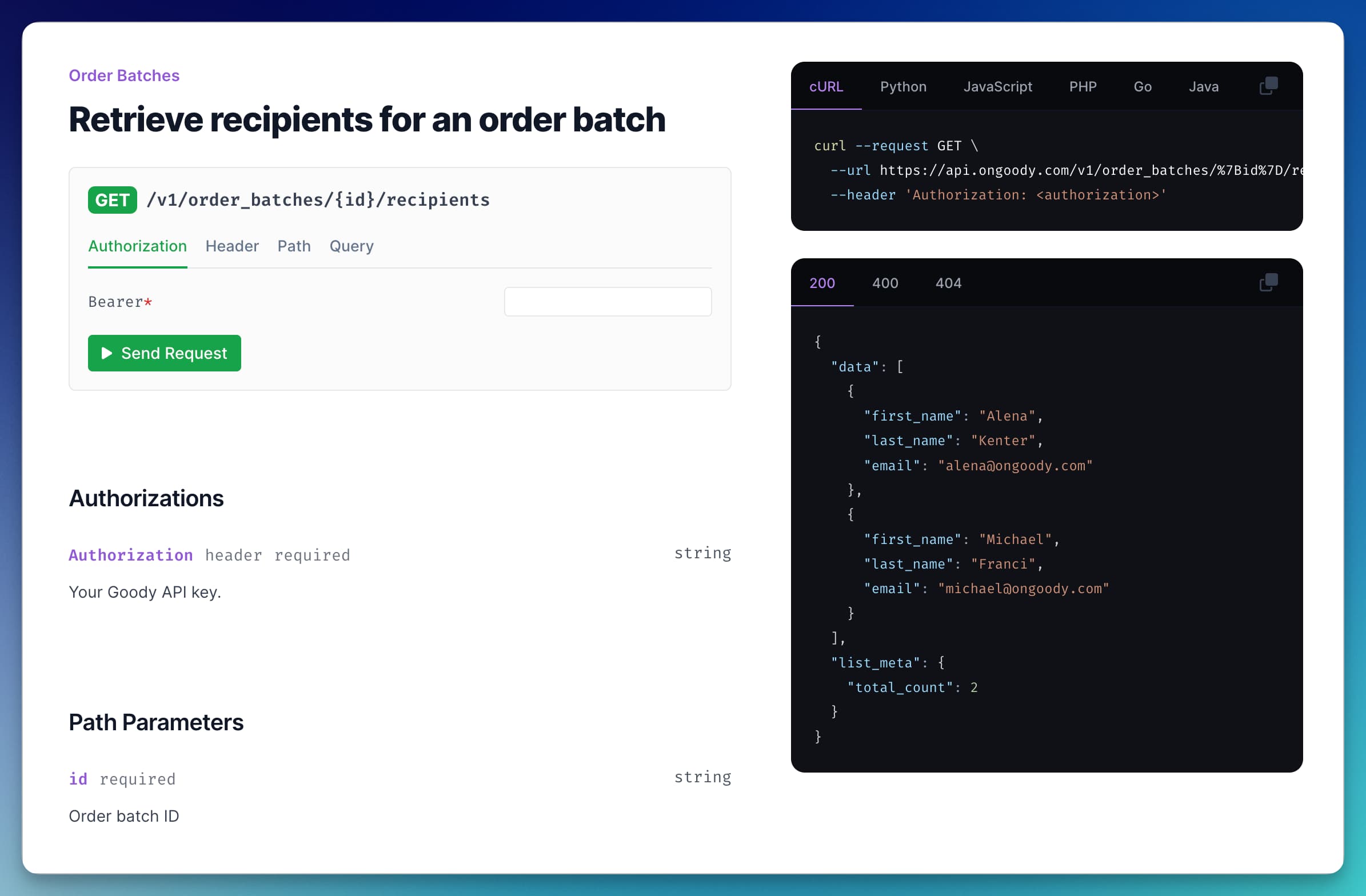 From your OpenAPI spec, Mintlify renders an API page like this: