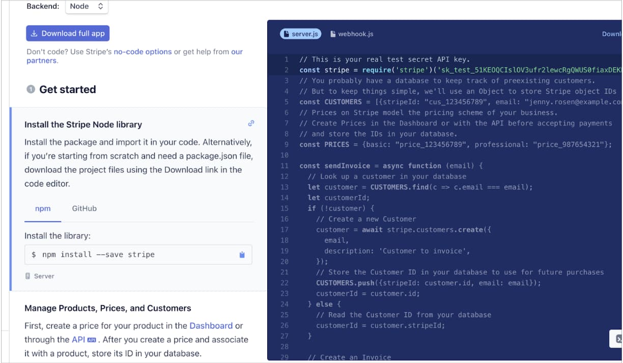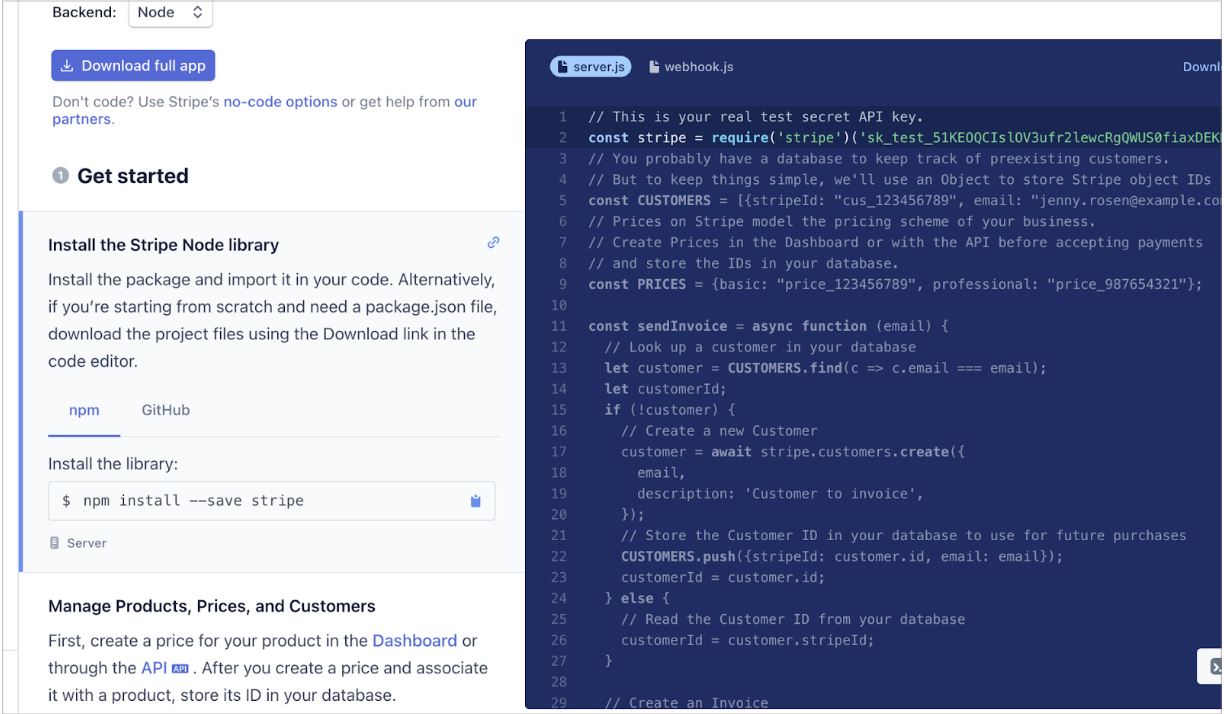 Instead of relying on large blocks of text, Stripe's docs use custom features to improve interactivity and usability. Users can customize the docs to display code in their preferred programming language and see code examples in Node, for example.