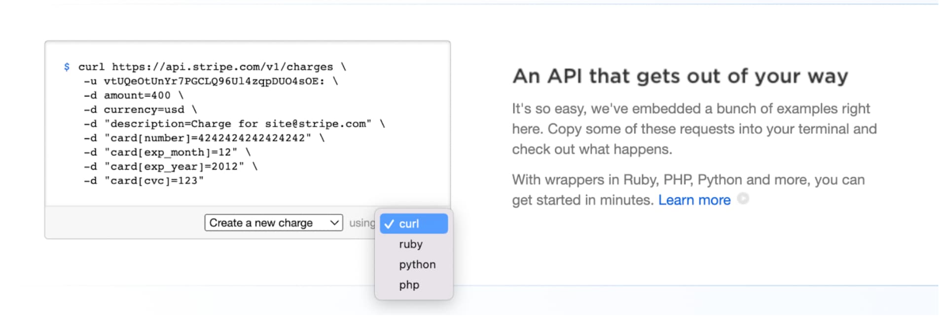 Stripe's docs are also interactive and tailored to individual users depending on where they are in their onboarding process. For example, a user's API test keys are automatically added to code samples, a subtle detail that makes for a great user experience.