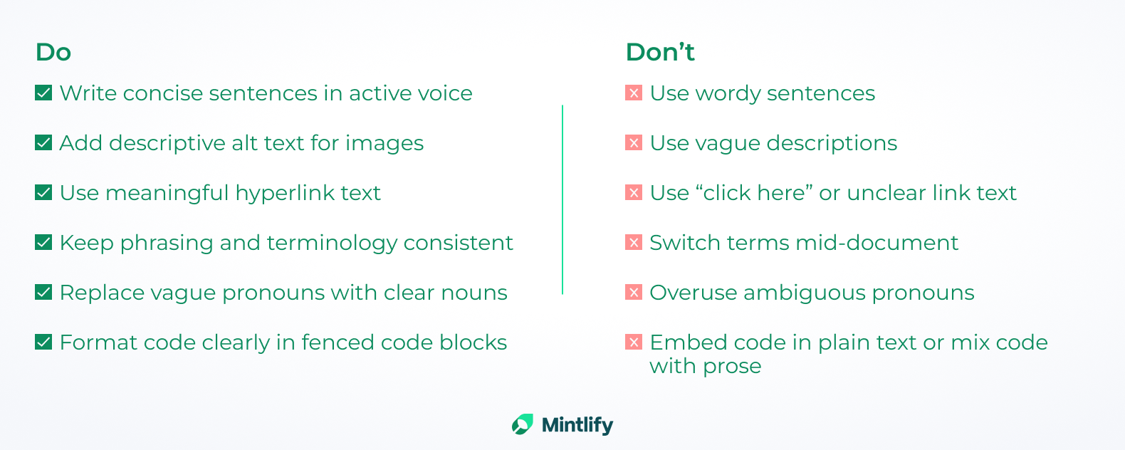 - Minimize vague pronouns: Reduce the use of vague pronouns, like "it" or "that." Repeat the noun so your audience knows exactly what you’re referring to. You shouldn’t say "The API creates a token after authentication. It should be stored securely." Instead, you would say "The API creates a token after authentication. The token should be stored securely".