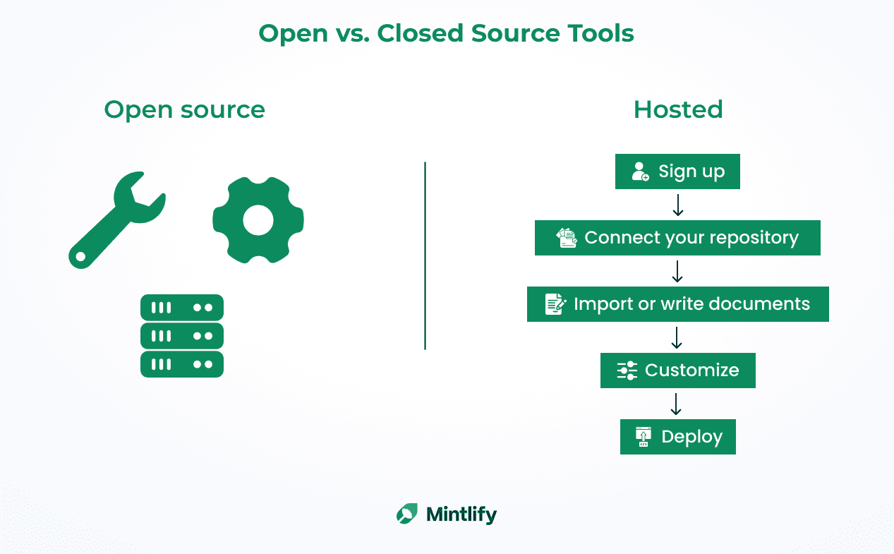 Hosted documentation platforms let you launch quickly, while offering automated deployment pipelines, built-in hosting, and access to advanced features. However, they offer less control than open source documentation tools.