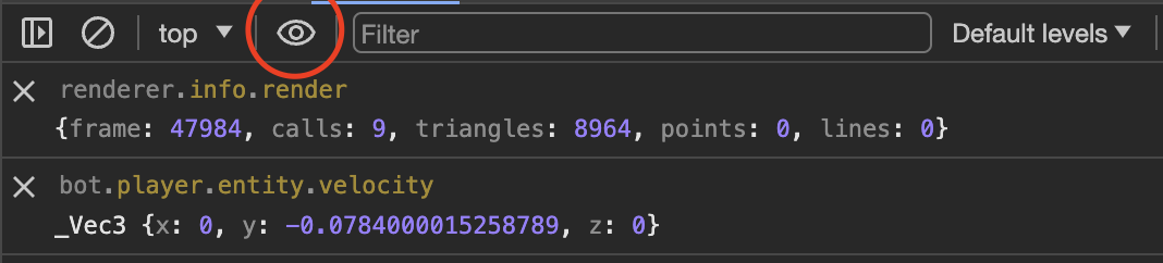 // Camera position (updates continuously)world.getCameraPosition()// Current chunk position`${Math.floor(bot.entity.position.x / 16)}, ${Math.floor(bot.entity.position.z / 16)}`// Player velocitybot.entity.velocity// Current health and food`HP: ${bot.health} Food: ${bot.food}`// Loaded chunks countObject.keys(world.sectionObjects).length// Memory usage(performance.memory.usedJSHeapSize / 1024 / 1024).toFixed(2) + ' MB'